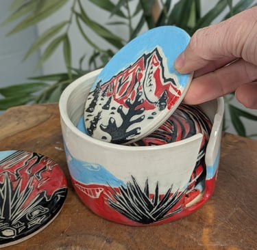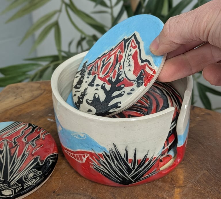 Both techniques are traditionally done with black slip on light clay, but I also enjoy incorporating a palette of desert reds, ochres, and blues—bringing the spirit of the mountains and southwest deserts of Western US to scenes I carve.