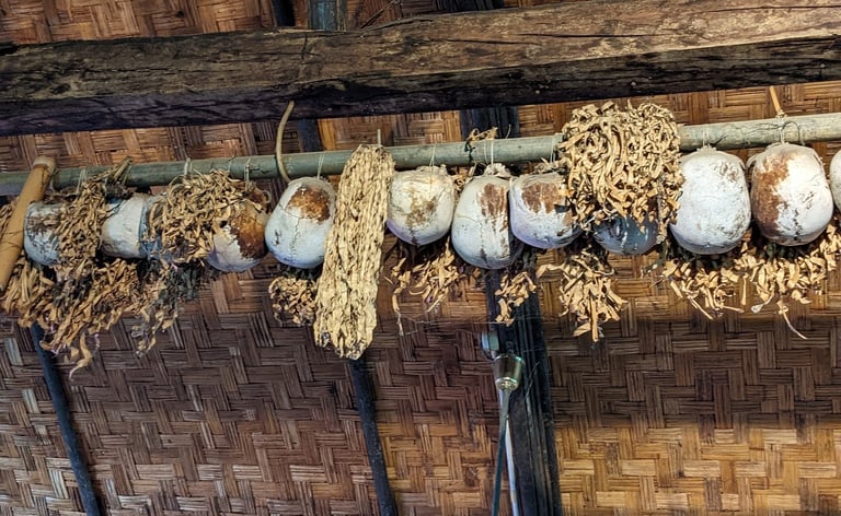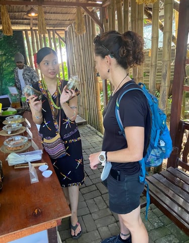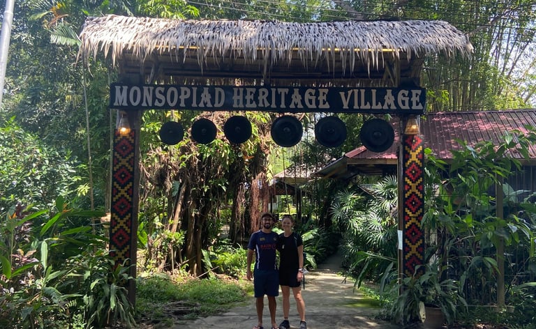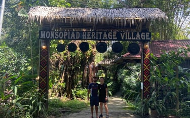 Above: Lucy, our favorite guide at Monsopiad, shares tribal specialty foods we could try. Behind her is the final course--live grub--which only Dana had the courage to try. We joined her and the other staff in trying out some traditional dancing. Below, the entrance and the human heads for which the village is famous.