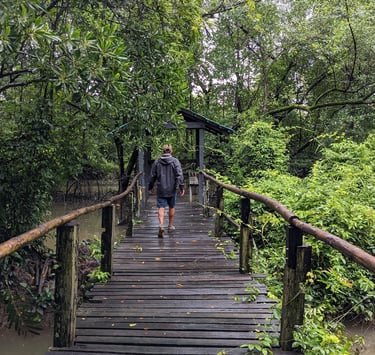 We started our stay with a local hike to a mangrove wetland preserve. We were the only people on the boardwalk trail. It was damp, littered with tiny crabs, lizards, and, sadly, plastic waterbottles, and frankly left us a little creeped out. But along the way, we noticed at least one snake in addition to several cranes and other birds, and to Dana’s delight, we spotted a family of river otters! The woman at the front desk had showed us a loop route through the mangrove, and noted the last section of the loop trail was not a boardwalk but led back to the entrance. But when we arrived at that last section, the trail sign pointed left and the board walk steps descended into at least two feet of mangrove water and mud!! There was no way were stepping in that! We walked back the way we came.