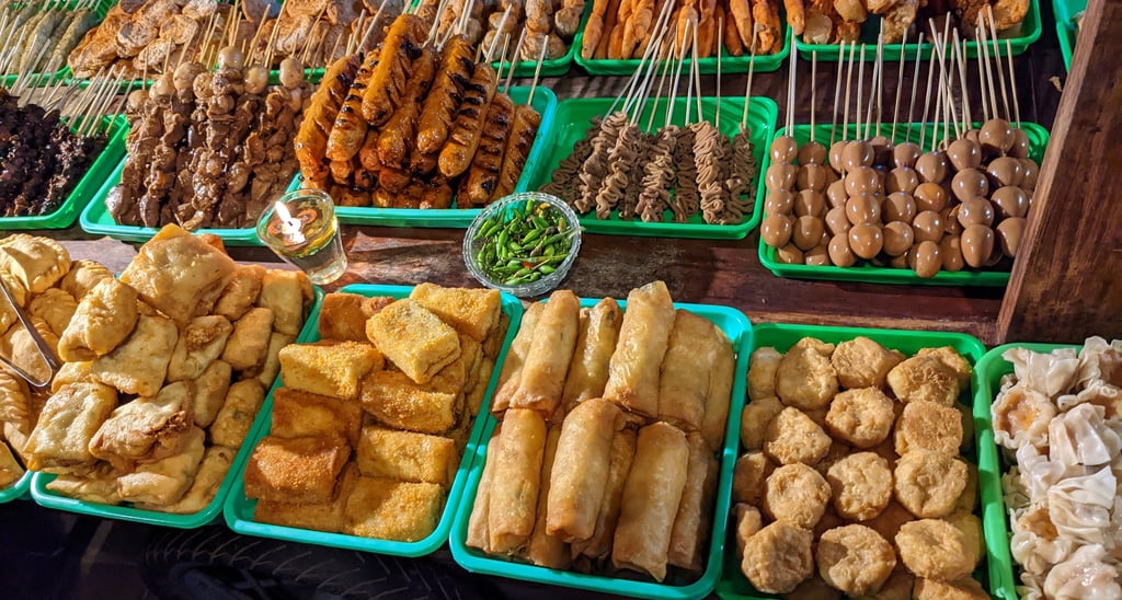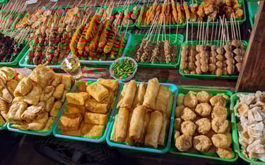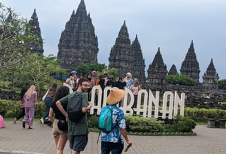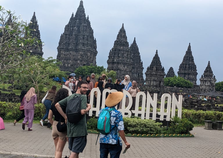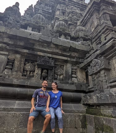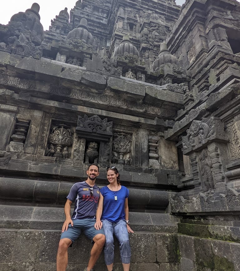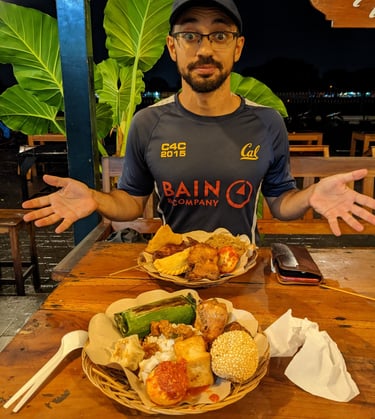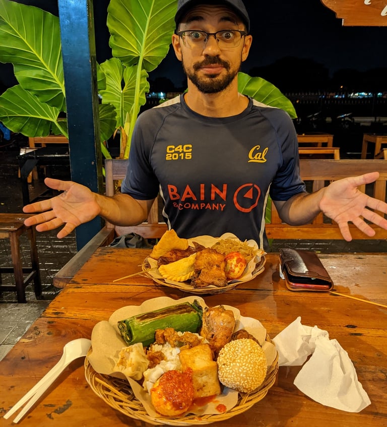 After saying our farewells to Singapore and stopping for one last mango steak (my newly discovered love in the fruit realm), we made our way to Indonesia, where we would travel overland (and sea) from Central Java to Bali. Our journey began in Yogyakarta (pronounced joug-Jakarta), which is often described as the cultural capital of Java. Compared to the Jakarta at 10.5M people, we felt Yogyakarta would be more our speed (~500k pop., much smaller city). After a long but highly efficient train from the airport to the city, we checked in and made our way to the palace and city center, braving rain for a walk down the renowned Maliboro St. Lined with shops, restaurants, and performances, this street serves as city center, with Dutch era colonial buildings bookending the street and quick access to the centra station nearby. We stopped off at what appeared to be a buffet of sorts, with dozens of dishes laid on carts in a shelter. There were no labels and no one spoke english, but it was definitely the place to be for the locals around so we went for it! Wedined on an array of satays (various meats and tofus on sticks, including several differently flavored chicken heads) tempeh, baked tofu, little pockets of rice wrapped in banana or coconut leaf, sesame balls, and other entirely unidentifiable dishes to our un-educated eyes. We got a little worried, questioning our choice to eat street food, not straight off the fire and not knowing what it was, but proved to be good food and non-illness inducing.