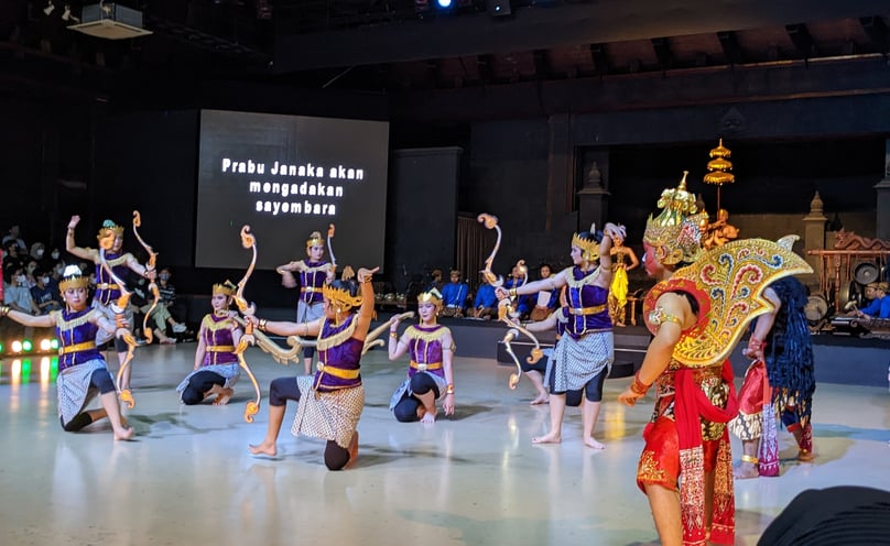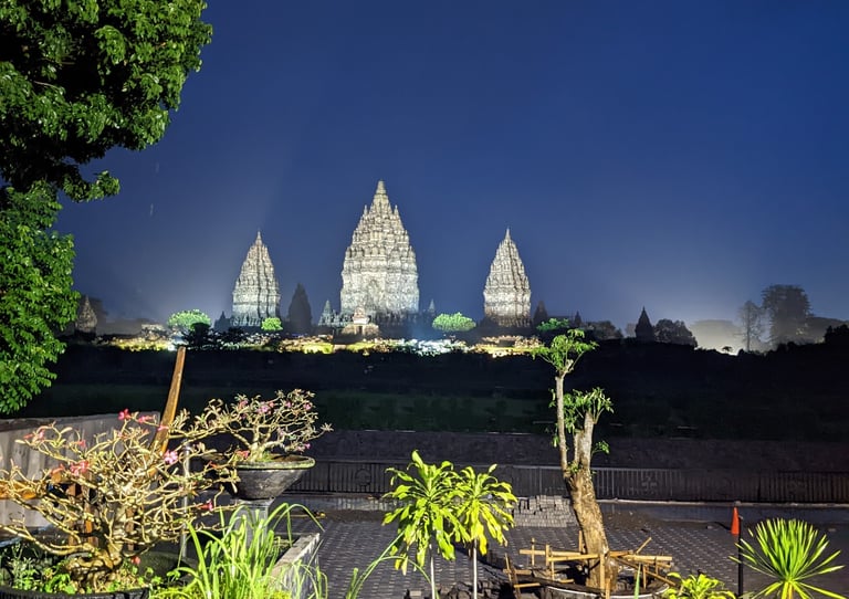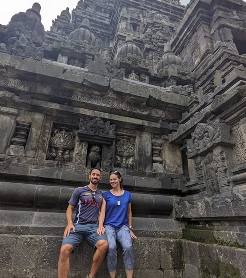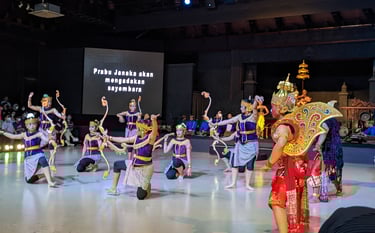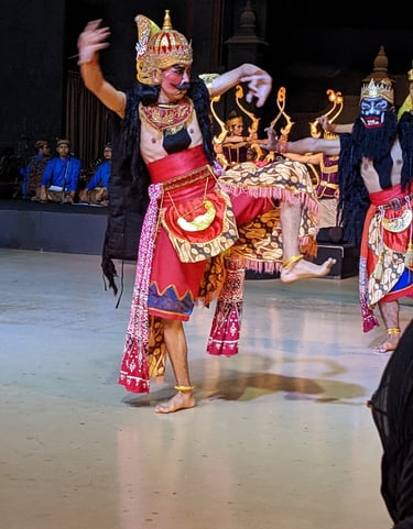 Our day of adventures continued with a viewing of the Ramayana Ballet. We waited for the start of the play at a restaurant overlooking the Prambanan temples as sun set and the rain started. The meal was an open buffet and aimed at visitors, so we were finally able to put some names to foods, as each was nicely labeled. I absolutely loved a drink called wedang sendang, a hot drink made from ginger and a bark of sappan wood, while Dana enjoyed the Java tea, a black tea with Jasmine and other flavorings in it. After chatting with our neighbors, an a Australian ambassador to Indonesia and his wife, we wandered into the theater. The ballet was a fantastic performance of dance with strong theater elements, set to live gamelan instrument performance. The dance is a retelling of sections of the Ramayana, a very popular Hindu religious epic. It is about Prince Ramayana's quest to rescue his wife Sita from an evil king, with help of the monkey god Hanuman1. Honestly there is so much history between the temple and ballet that I’ll leave it to Dana in case she wants to do a dedicated post; a single line or two here just don’t do either experience justice.