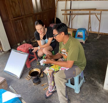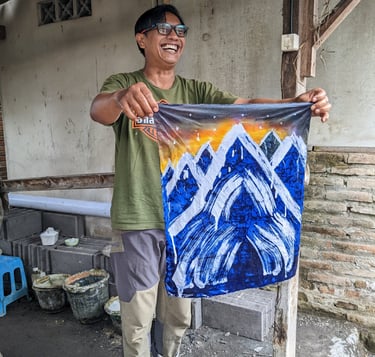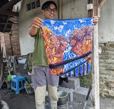 Our time in Yogyakarta ended at a local village, where Dana and I spent the day practicing in the traditional craft of Bhatik making. This involves using Layers of wax and dyes to create intricate patterns on cloth for traditional clothing (and today, for all sorts of textiles), including what I’ll call a hot wax pencil for doing highly detailed work. Our hosts for the day were true experts in those craft (we viewed their exhibition at a nearby gallery over lunch, and they apparently have showings in New York fairly regularly). Despite my lack of artistic ability, Dana and I successfully created our own murals (with the helping of the dying expertise of artists)! With that, we wrapped up our time in Yogyakarta and made our way east to Malang by train and bus (~6 hours, very nice business class), where we would seek out adventures of a volcanic nature.