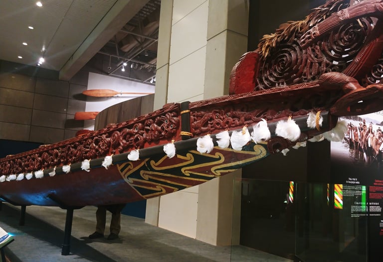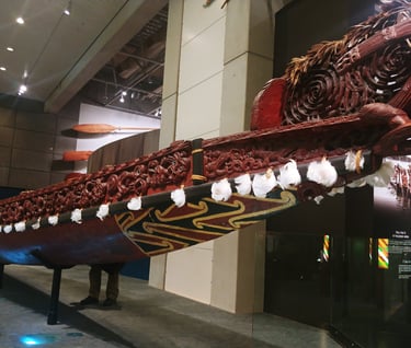 Our adventure on the North Island started in Wellington, the nation's capital and a beautiful coastal city reminiscent of San Francisco (though not quite as hilly or densely populated). After our late arrival into the central business district, we made our way the next morning to the Te Pau museum, which vastly exceeded our expectations. The museum was an amalgamation of art, nature and science, Māori culture, and more. Perhaps most interesting were full size Maori made boats (which traversed the Pacific from islands like Hawaii and Fiji all the way to New Zealand, like around 12-1400CE) and carved wood ceremonial buildings. Another fascinating exhibit tracked the arrival non-native flora and fauna to New Zealand, how it likely arrived and what impacts there had been. Given the day of the week, we had the added benefit of enjoying a weekly farmers market outside along Wellington's lovely oceanfront boardwalk.