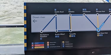 The Brisbane River, a map showing us the city and kitty cat routes and the riverside brewery.