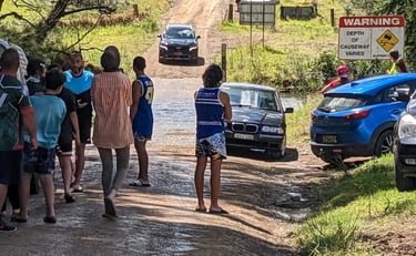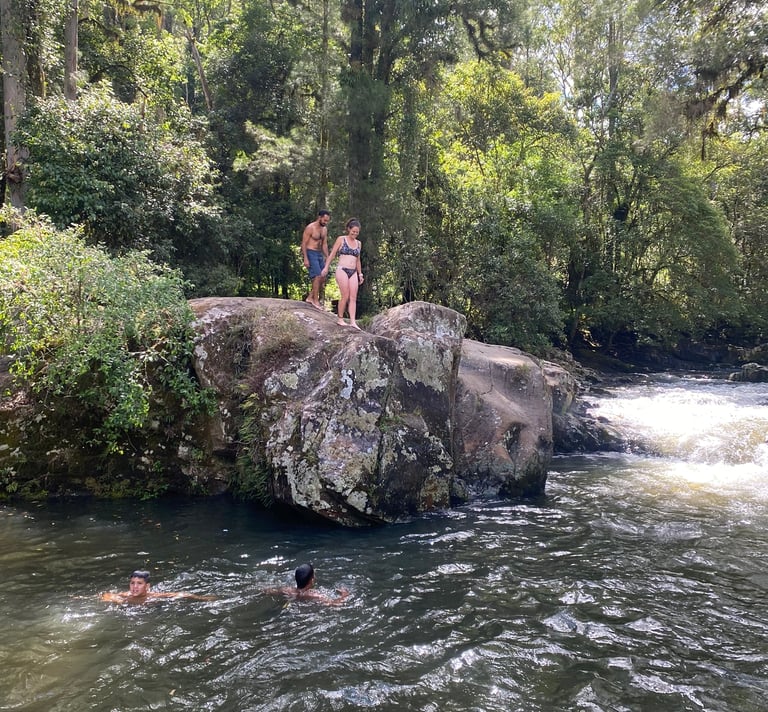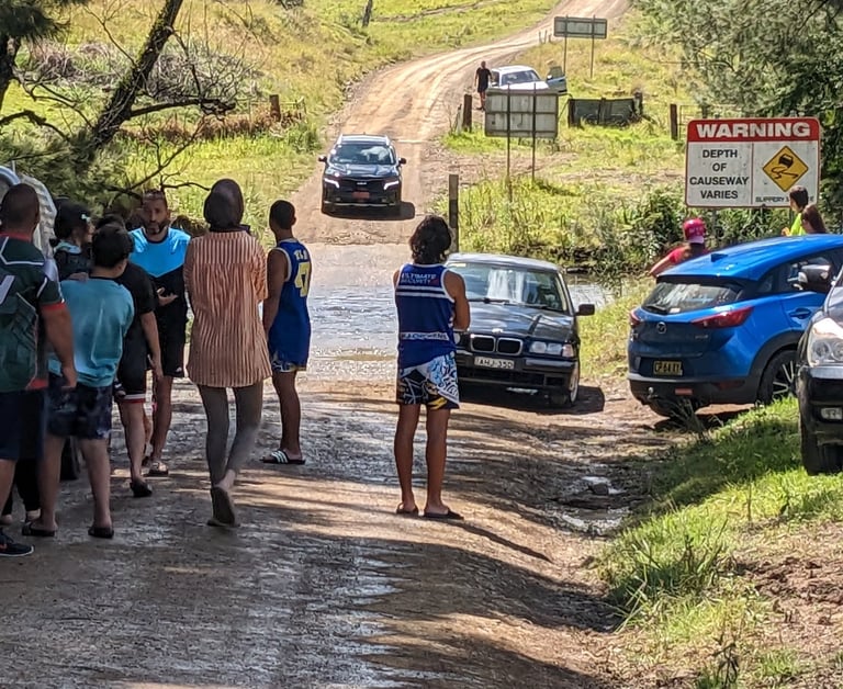 We had a restful evening playing cards in the common area while it poured rain and slipping into slumber in our unique rooms. It was still raining the next day, so we headed straight on south and in-land hoping for the weather to clear. I had read about Kosciuszko National Park, where there was supposed to be nice hiking and good swimming holes. What my research hadn't turned up was the perils along the way. We turned off the main road onto a narrow and windy 2-lane road, which in turn turned into a dirt road, and then we started crossing over depressions in the road accompanied by ominous flood warning signs, and finally came across one that also harbored a knee deep stream running across it and an especially large flood warning sign. We pulled off to evaluate the situation and were soon joined by a whole gaggle of other cars. Several of these were trucks with tail pipes that were like snorkels, and we suddenly put two and two together about why there were so many such vehicles around this country. But none of them were crossing either. We were just about to turn around, deciding it wasn't worth the risk, when a mini-SUV appeared from the other direction and, un-hesitating, plowed right through stream. The spell of uncertainty broke, and all the other cars began to cross. We followed along in our rental car, vowing to turn back if we saw narry a storm cloud in the sky. Luckily the skies stayed blue and we joined a group of cheerful friends who had made their way to Ladies Well, a fantastic swimming hole on the creek with a great cliff-jump. Shadie and I both the got the courage (with some of us taking a bit more time to gather it than others (cough, Shadie, cough)) to leap off the boulder. The swim savvy Australians did not hesitate to leap, including several small children that looked not a day over 5.