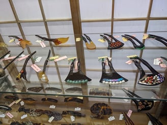 On our second day in Kyoto, we took a free walking tour of the Gion district, most famous as the home of the geisha. In fact, the tour was all about the geisha. In her introduction, the guide smiled wryly and said, by the end of this tour you will understand why so few women are becoming Geisha today. She took us to many haunts of contemporary geisha, from the group housing of the geisha still in training (called Maiko), to the tea houses (which are no longer serve tea but are still called tea houses) where they often perform, to the shops where they buy their exorbitantly priced hair combs and kimono. Our guide told us that Geisha, as the representatives of Japanese culture, are prohibited from using modern technology in public. But, she said, you can often see a Maiko sneaking a peak at her cell phone in the folds of her kimono when no one is looking. The life and training of geisha is demanding, exhausting, expensive, and uncomfortable. And while geisha are still revered, and their visage is everywhere in the country, the number of geisha in Kyoto has shrunk from many thousand at their most popular in the late 1800's to an estimated 150 or less today.