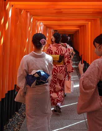 The famous red gates of Fushimi Inari Taisha. The women pictured are not geisha, just Japanese tourists dressed up in kimono for the occasion of walking the gates.