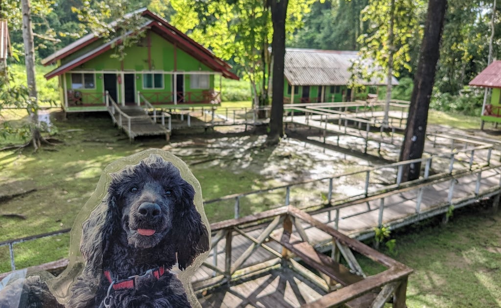 Stand-up Winnie enjoyed Sukau Greenview Lodge, as did we. There was a main building that was the kitchen/dining area, and separate cabins with boardwalks out to them to account for the monsoon rains that were getting started while we were there. Quite comfortable really.