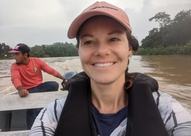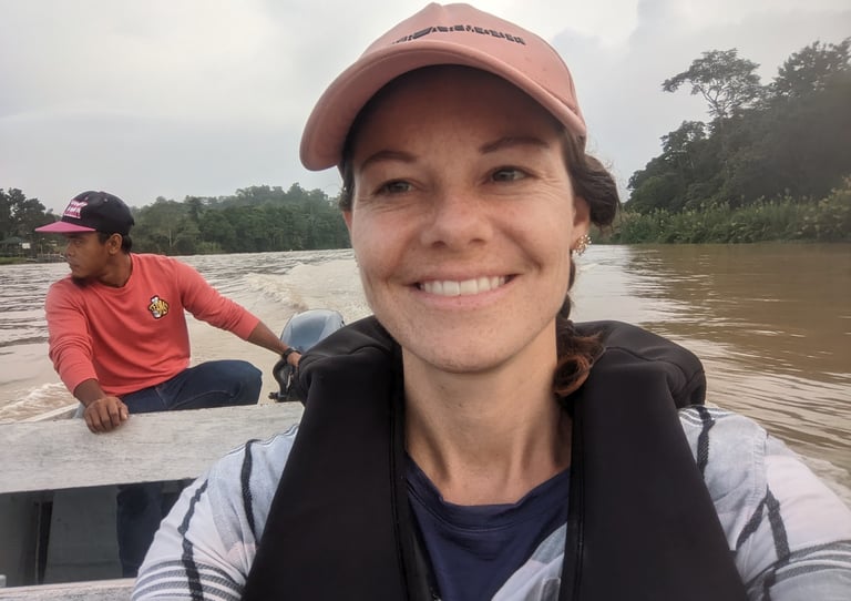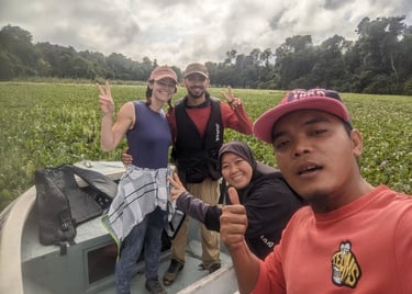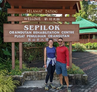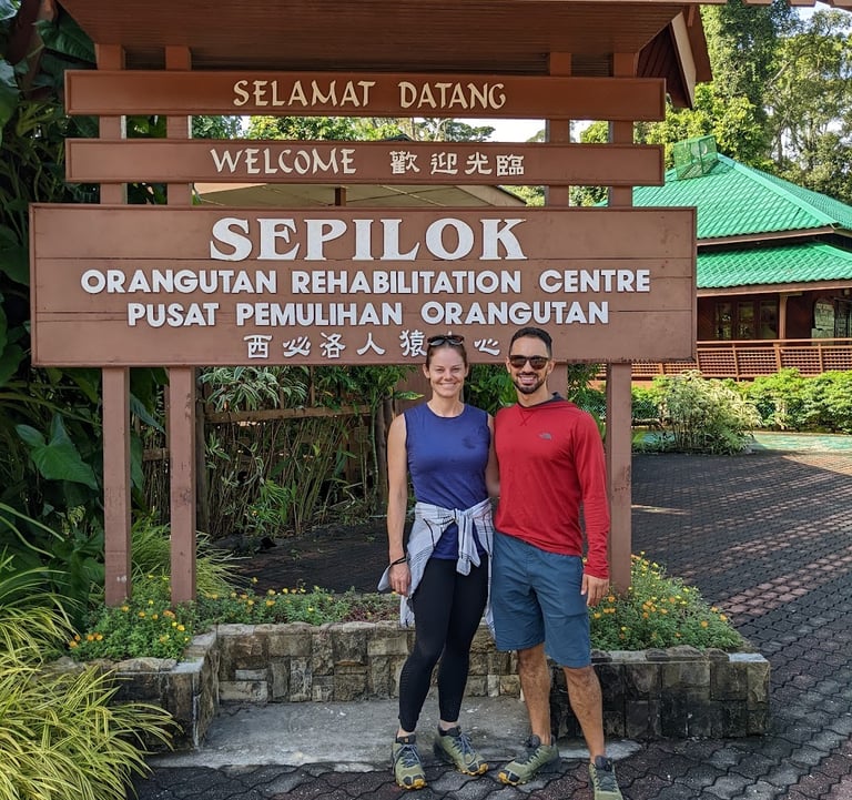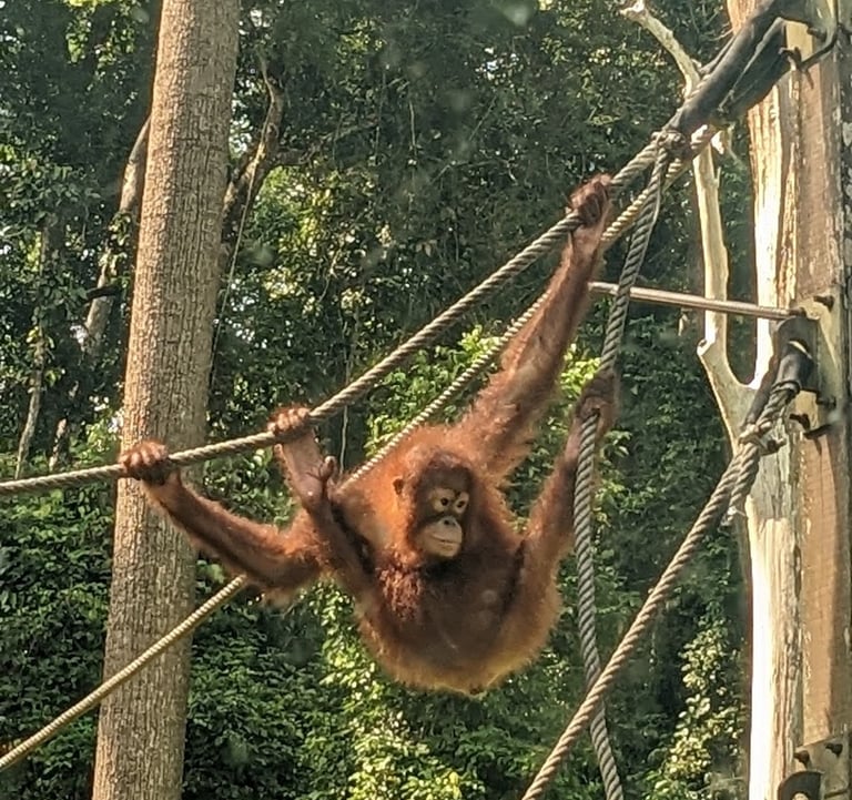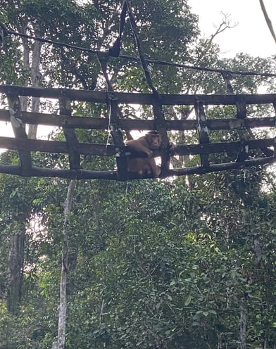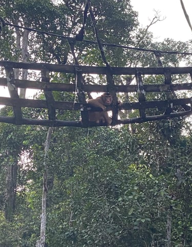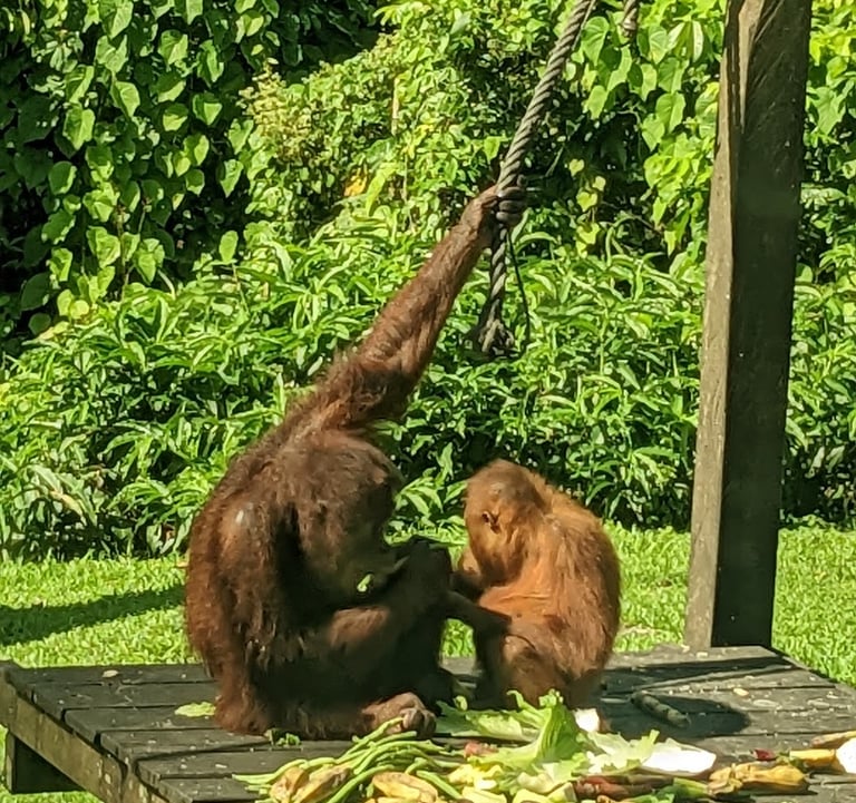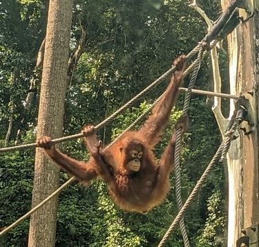 Do any of you remember Amazon Trail? Well we were off on the Amazon trail, except not in the Amazon and not a trail but a river, and not a video game but real life. And no paranahs. But we were headed to one of the only virgin rainforests left in the world, the only others being in the Amazon. We took the shortest flight I've ever been on, just 35 minutes, from KK to the small town of Sandakan in far north Borneo. The flight departed bright and early so we could arrive in time for the start of before our multi-day tour at 8AM. This was our first organized tour of the trip and would be a three day, two night stay along the Kinabatangan River. Back home, our friends Micki and Bob S. had shared stories of the wildlife they saw traveling in this area when Bob was brought here for riverine research. It inspired me to try and find these beautiful wild animals...while there are still some of them left.1 The goal: see the famed Proboscis monkey, as well as the quickly disappearing orangutans and other native wildlife. Our tour started at the Sepolik Orangutan Sanctuary, where we arrived in time for breakfast (theirs, not ours), seeing several of the majestic species from a relatively short distance. These young ‘tans are all rescues and nursed back to life and, in some cases, re-released into the wild. They were very cute indeed, swinging lithely from both their hands and feet as they went for the snacks; surprisingly they were much more into the served up cabbage leaves than bananas!!