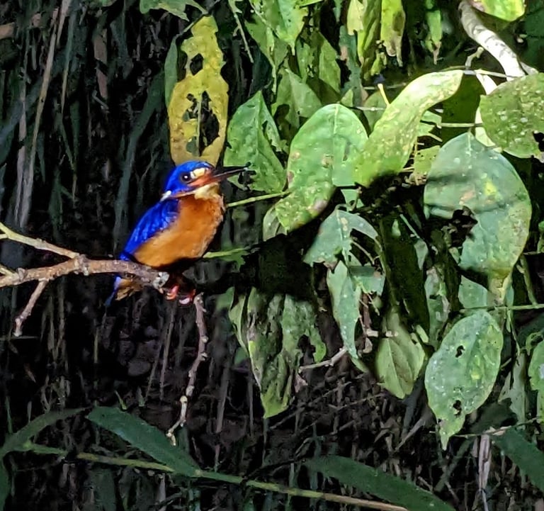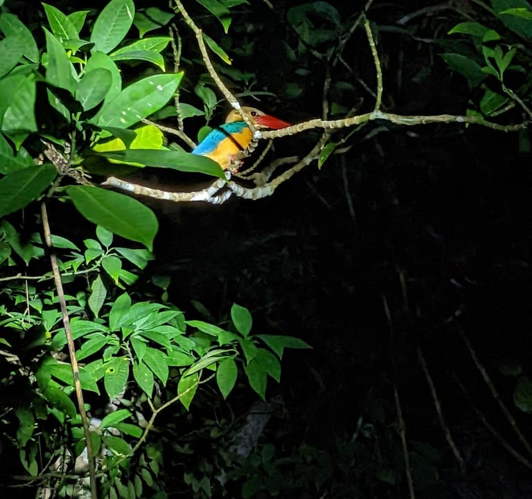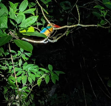 This blue-eared kingfisher blinked at us under the strong flashlight, but didn't move.