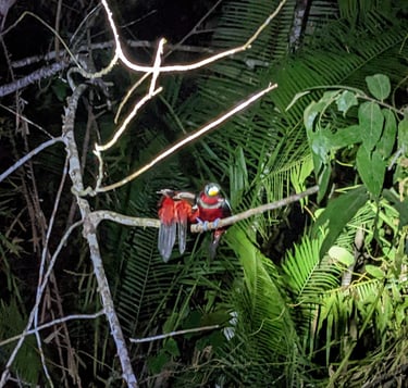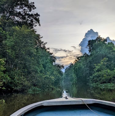 After hanging with the orangutans and a long lunch break, our driver whished us onward two hours further into the country, past acres and acres of palm tree farms until finally arriving to our Ecolodge, Sukau Greenview Lodge at the edge of a tiny town along the Kinabatangan River between two sanctuary areas. Our itinerary included a sunset, night, and sunrise nature cruise, all of which featured an array of wildlife. We dropped off our bags and headed to the boat for our first foray into primary Bornean Forest. Our guide, Rex, was incredibly knowledgeable and spotted wildlife faster than you can say monkey. That first evening we saw several types of birds, the common long-tailed macaque ("gangsters" of the forest according to Rex) and several groupings of proboscis monkeys2. The proboscis monkeys are endemic (aka only found in) this region of Borneo, and live either in small groupings of bachelor males or larger groupings of “harems” of a dominant male, females, and youngins. They are handsome, orange and white, and have extraordinarily long noses, which are their namesake. After the tour, the kind but quiet lodge hostess served us a simple dinner of rice, a stew with dark meat chicken, and eggs.