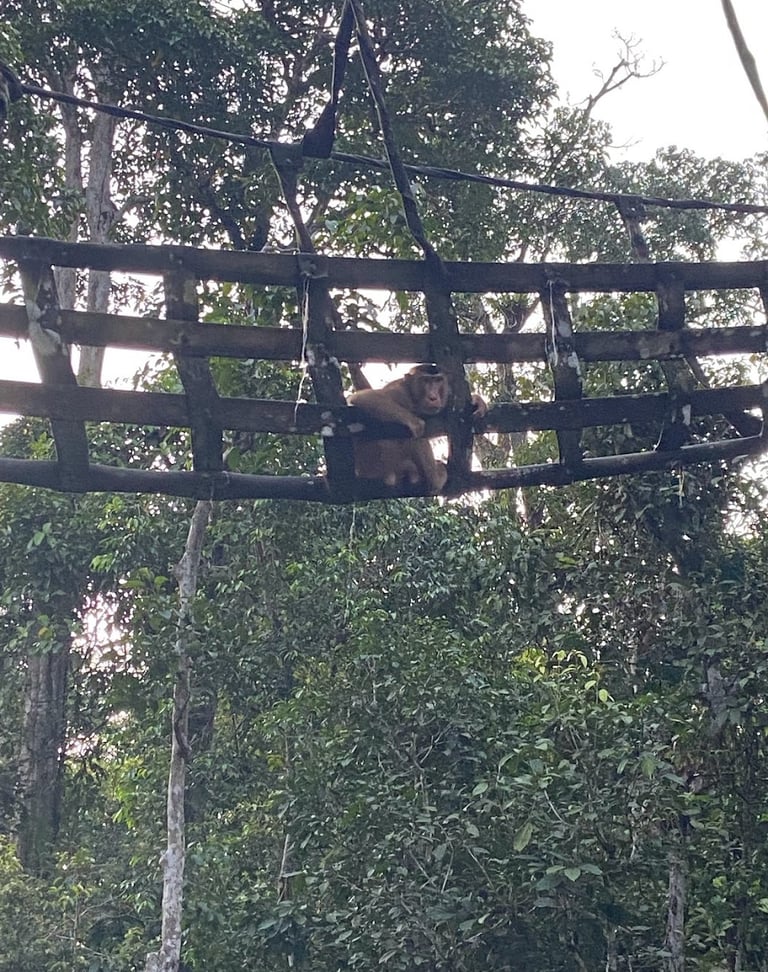 The long-tailed macaque may be a pesky thief but they sure are cute frolicking on this rope bridge left for them by the conservation department.