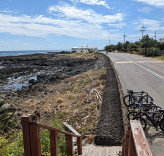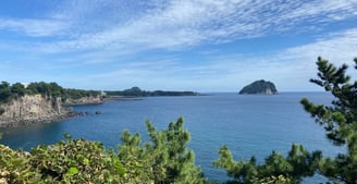 The careful readers among you may have noticed I skipped from day one to our day three Hallasan hike in this narrative. In doing so I passed over another great experience: the coastal bike ride!3 On day two, much more well rested, we rented some E-bikes for the decent price of $30/day and commenced a ride along the coast. Jeju seems to draw a lot of bicyclists. In fact, many of the folks on the ferry were spandex clad Korean men, clearly ready for multi-day bike-packing. It's so popular, there's a blue line that runs along the recommended coastal route counterclockwise, that you can easily follow around the island.