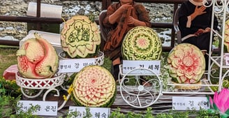 Our meanderings later brought us sighting of yet another lovely waterfall, Sojeongbang, and some free live music performance and festival along the shore that also featured some beautiful and impressive melon carvings.