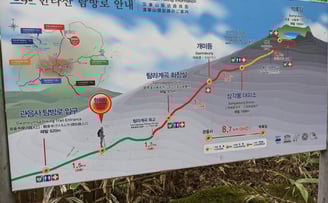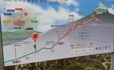 Hallasan was perhaps my favorite hike so far. Lots of pleasant red pine forests, occasional open vistas showing the jagged peak and well-maintained trail. At bottom right is one of the handy signs along the trail that show your progress and level of difficulty by section.