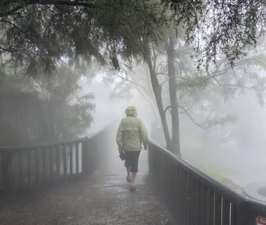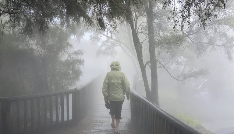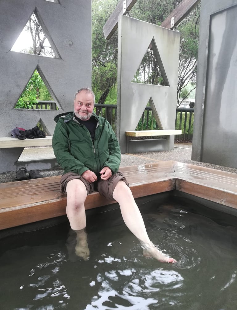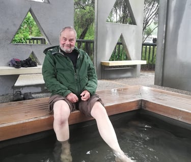 Mom is walking on a boardwalk not through mist but steam coming off a geothermally heated pond! Dad enjoys the free geothermally heated footbath.