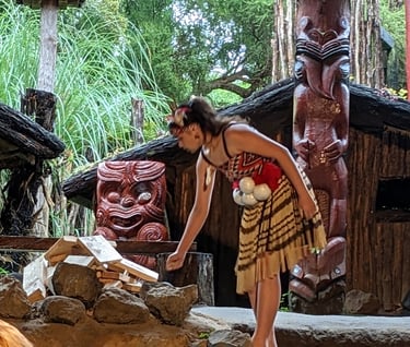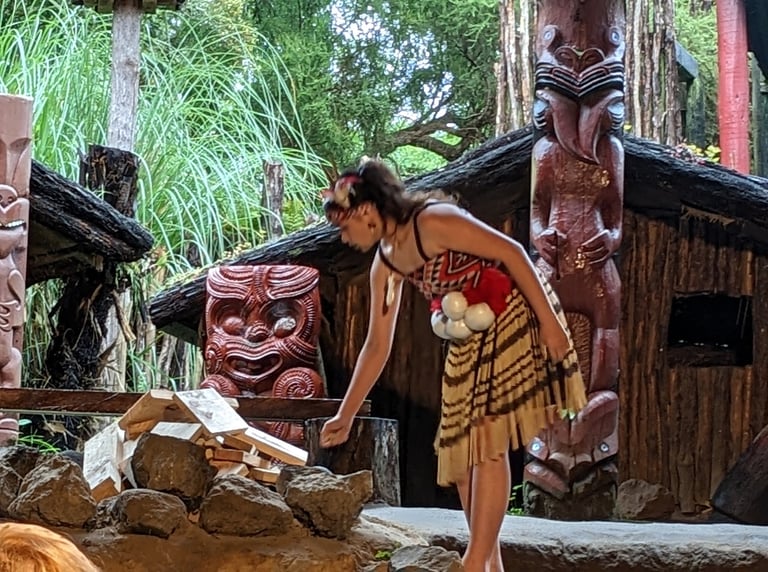 But, it wasn't the redwoods or even the geothermals that had got Rotorua on our itinerary, but for a more cultural attaction. Rotorua is the heart of Te Puia’s Whakarewarewa Valley, home to a living Maori village and the New Zealand Maori Arts and Crafts Institute, with traditional wood carving and weaving schools. In addition to seeing amazing carved wood statuary and gates throughout town, we also paid for full Maori dinner and cultural show. I hope to write a more extensive most on the Maori later, but a few short thoughts on the Maori here. First, the experience of Maori when Europeans arrived shares some similarities to Native Americans in some ways, with issues of disease, land stolen, and misunderstandings. But the Maori have managed to stay better off in terms of presence and rights than most Native Americans for a variety of reasons. Second, the Maori themselves are relatively recent arrivals to New Zealand in the scheme of history, likely first arriving sometime between 1200 and 1400CE. Much of their cultural mythos speaks about how their ancestors sailed across the sea from Hawaiki, likely somewhere in East Polynesia or maybe even Hawaii, making the similarity in nomenclature not coincidental. The similarities to Polynesian culture was quite evident. In fact, the dinner, a mix of meats, tubers and veg cooked over many hours in a ground pit, shared many similarities to the luau's many Americans get to experience when visiting Hawaii. Our Maouri hosts also treated us to a wonderful dance performance and answered many questions about their historic culture and current practices. It made for an enjoyable and educational evening.