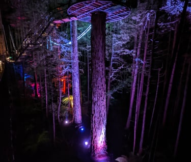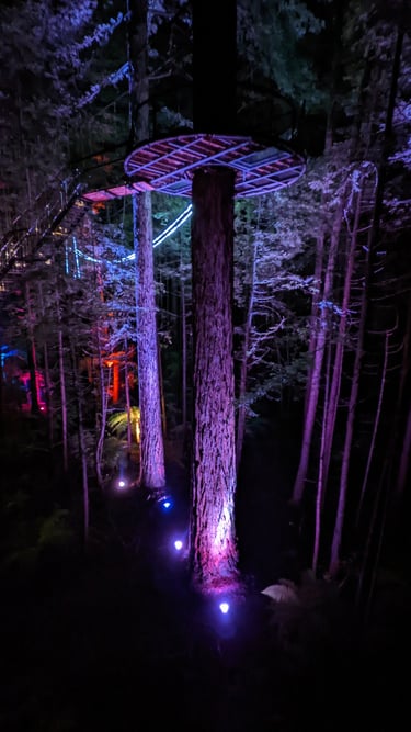 It was in this grove of California Redwoods in New Zealand that we bundled up in our rain jackets and bought a ticket for a canopy walk. After climbing a spiral stair you then boarded rope ladders hung several hundred feet in the air and strung between the trees. The walk is a little less than a mile and offers fantastic views of the big trees and the misty, fern-filled canopy below. We liked it so much we came back for a second walk at night, which had lighting effects and felt much more like a light show than a nature walk but still was an enjoyable experience!