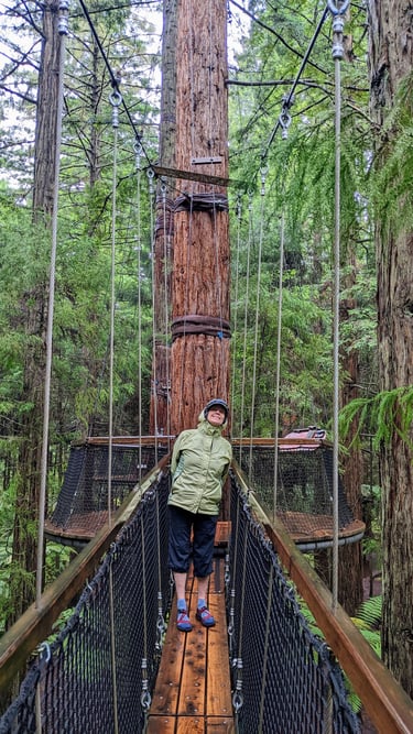 We were disappointed that the weather once again turned on us even as locals continued to tell us the rain was unseasonable. It rained and winded the whole time we were in Rotorua. That didn't stop us from trying out several outdoor wonder experiences. Perhaps the most memorable for the whole family was a skywalk through super-sized redwoods. These redwoods are the very same tree species (Sequoiadendron giganteum) I know and love from California's Redwood National Park, and the same species as Hyperion, the tallest tree in the world. A large grove of these trees grows in the forests right outside Rotorua. The Redwoods are not native to New Zealand, of course, and were planted here for the timber wood in the 1800's. Interestingly, though, they seem to love New Zealand more than California! While these Sequoias only find an ideal home in a narrow strip along the California coast, much of New Zealand has ideal weather for them, with the mix of mist, moisture, cool, heat and fire. But New Zealand gets a heck of a lot more moisture than California does and so the redwoods here grow much, much faster! While none of the redwoods in the grove we walked were as tall as the Grove of Giants, they were still quite giant and many hundreds, if not a thousand, years younger.1