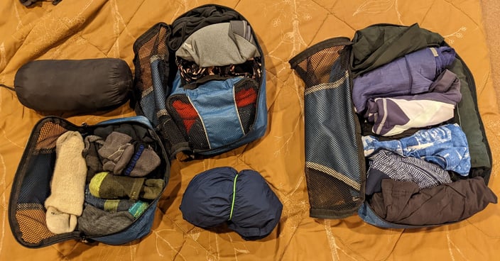 First, less and lighter is better. I find this to be critical the more you venture off the beaten (and paved) path-- and we intend to venture off the beaten path often! We are far from the lightest travelers out there but did work hard to fit our stuff into one carry-on backpack and a small daybag each. And in doing so, we hope to force ourselves to travel light and also save a bit on airline luggage fees and risk of lost bags.Second, cotton is not king. If you follow rule-of-thumb one, you may be washing (likely hand-washing most of the time) a limited number of clothes items quite often. Cotton is slow to dry, heavy, and bulky. We packed a lot of synthetic and wool items, athletic tops, leggings, Smartwool socks and the like. There are pretty limited opportunities to wash and dry clothes on the go. Sure, there are laundromats around, but you have to find them, pay for them, and be able to wait around a few days to retrieve your clothes. I'm sure we'll use them on occasion, but certainly not every time we need to wash clothes. So far, we've also stayed a few places that have washing machines, but none have dryers. Not to mention virtually everywhere we are going will be both hot and humid. This makes quick drying wear all the more essential. That being said, I did bring one pair of lightweight denim shorts, as they're comfy, indestructible and more "normal" feeling than the technical clothing we have along. No regrets!