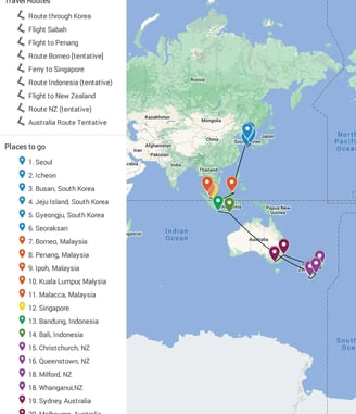 As of now, we are planning to visit six countries, including South Korea, Malaysia, Singapore, Indonesia, New Zealand, and Australia. The map to the right shows our current planned route. I hope to keep updating the interactive version on regular basis. You'll notice some country destinations are more filled out than others so far, and we'd love your suggestions about more places to go (or not go)!