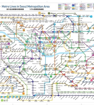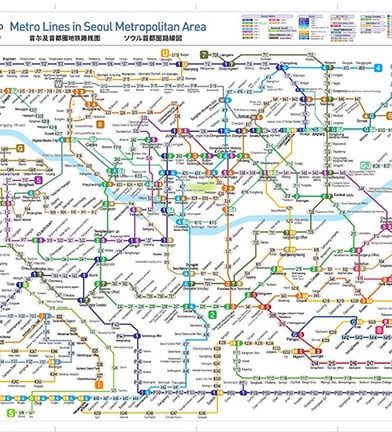 The Seoul Metropolitan Area subway system covers an expansive area, including Line 1 to 9 with additional lines, such as the Incheon Aiport line, Sinbundang Line, Gyeongchun Line, and a few other suburban lines. The central numbered lines generally run semi-circuits across the city. These are supplemented by a large number of bus lines.2