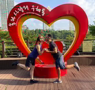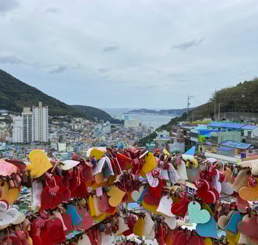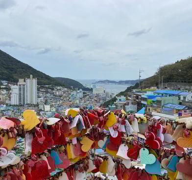 The cute or romantic setups paired quite seamlessly with an apparent national obsession with romance. Once again France has nothing on Korea in this arena. At many scenic hilltops, coast-lines, or even museums, you would find vending machines selling love locks (aka small, often heart-shaped padlocks) that lovers could buy and lock to adjacent fences, bridges, etc. Said lovers are frequently wearing matching outfits (in some case identical), which is quite the trend here. Add to this that eating alone is frowned upon.3 Often this romantic bent was enjoyable if a bit kitschy for Shadie and I, but, man, I thought being singleton in the US was rough, and so can't imagine how brutal it would be here!