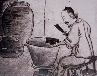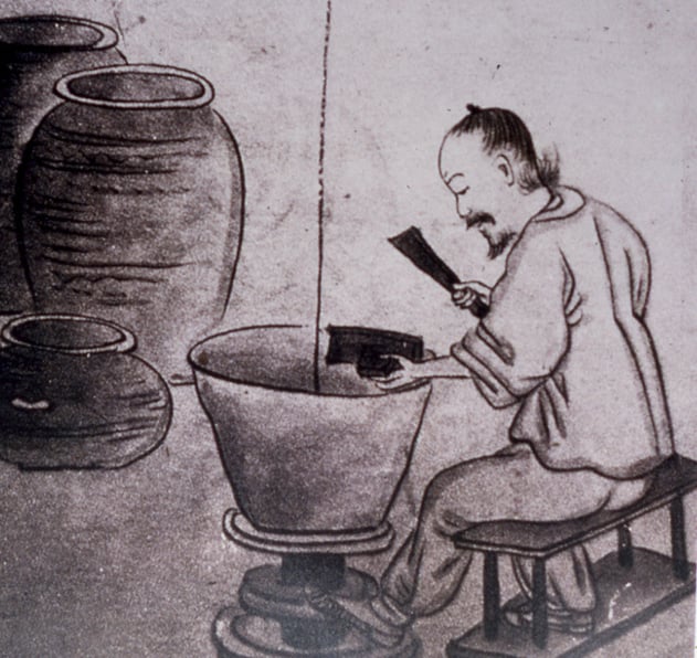 The actual defining aspects of Onngi seem to be threefold. First, the clay used, a more gritty iron-rich clay than Kaolin-rich white porcelain clay that was also available and used frequently for other makes in Korea. This clay is quite maleable but also able to hold its form very well while quite wet due to the amount of sand and large particles. Second, the clay is generally coated with a very natural glaze made of a slurry partially decomposed leaves and only fired one time, which also makes for a slightly porous material that allows some amount of oxygen exchange and for the kimchi to "breathe". Third, is the making method itself, which involved the use of large clay coils. The pots are then formed with specialized wooden tools, stretching and shaping the pot while it spins on a kick wheel that is set in a pit in the floor. No water is used, so they can make giant jars very quickly without the jar collapsing as it gets bigger.