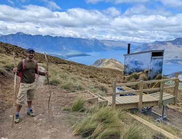 We've been impressed by the outhouses, neatly disguised with wrappings of photos of the same landscape on the Ben Lomond hike and several others in NZ.