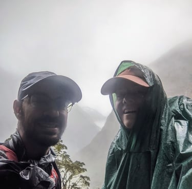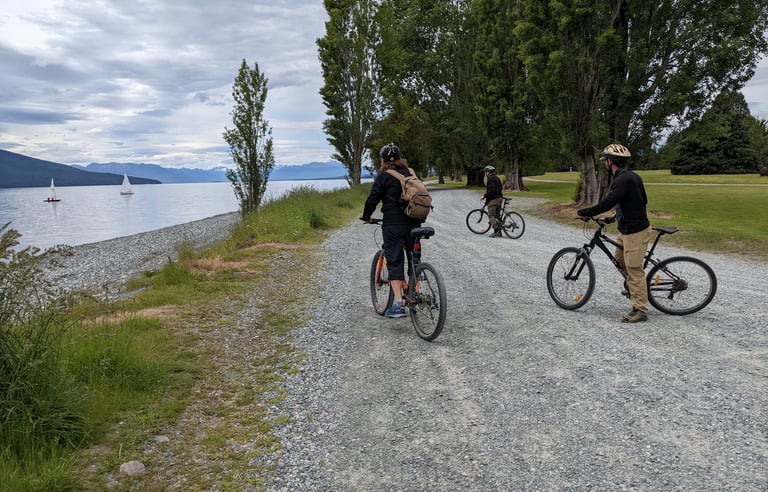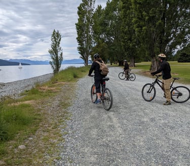 After waving see-you-later to Queenstown, we headed off to Te Anu, a tiny town a few hours south that is the jump off point for the Milford Track--more on that in a minute. Here we stayed in a Holiday Park, which are very popular throughout the country and are a kind of a mix between a top-notch RV park and Koa campground in the US. This one had a communal kitchen, a TV lounge room, a jumping pillow3 and a bike shed with bikes to check out, in addition to our small pod rooms. Te Anau is located adjacent to one of New Zealand's many stunning large lakes, and we enjoyed a nice bike ride on the gratis bikes along a gravel road next to it; my dad's first bike ride since getting knee surgery a few months back!
