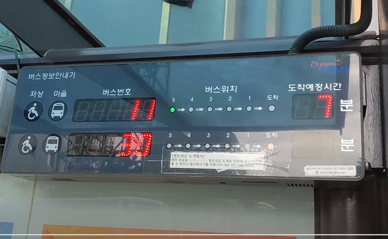 Both Korean and Japanese bus stops often have live updates on bus status. However, the South Korean stops have digital readouts, while the clearly older Japanese displays use flip markers.
